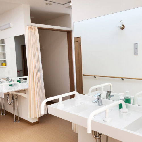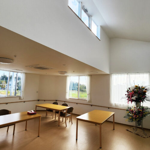 施設内には天井吹き抜けスペースもあり、解放感がありのんびり生活することができます。 平屋建てづくりの完全バリアフリー設計で暮らしやすく造られたホームです。